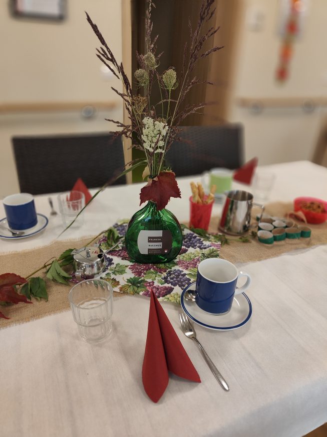 Wieder einmal fand bei einer richtig schönen Atmosphäre unser Weinfest statt. Bei toller Musik & Tanz, leckeren Wein & Federweisen , selbst gemachten Käse-Weintrauben-Spießen und natürlich Kaffee und Kuchen, hatten alle Bewohnerinnen und Bewohner einen sehr stimmungsvollen Nachmittag zusammen. Die Geschichten und das Quiz, natürlich um das Thema Wein, rundeten die Feier gelungen ab.